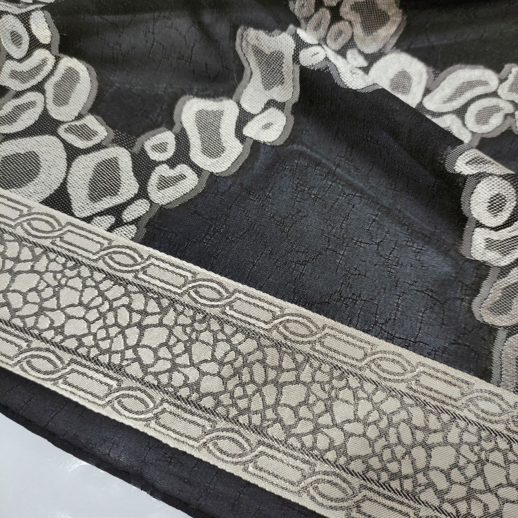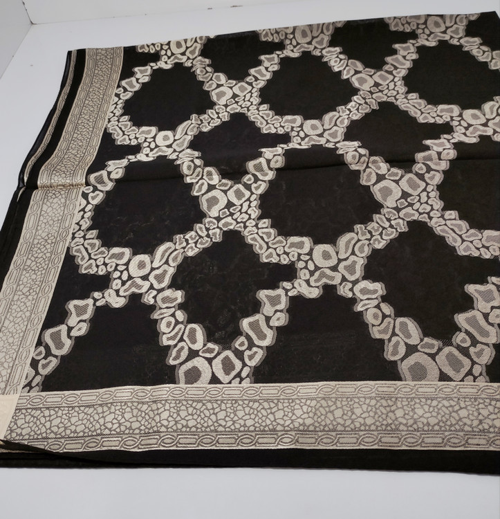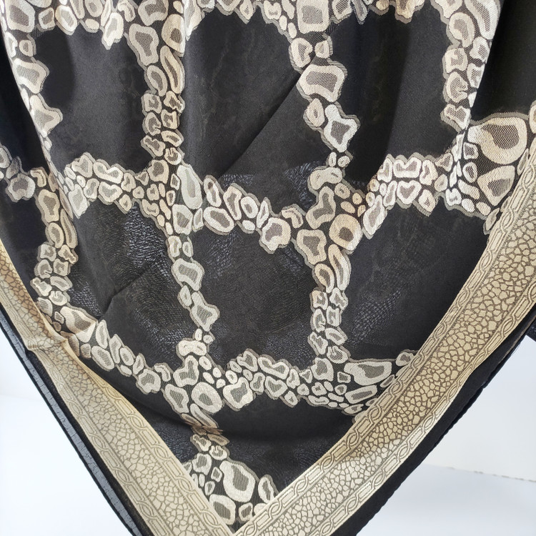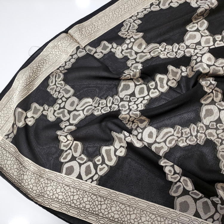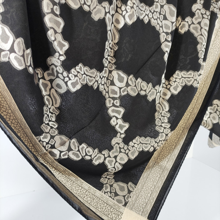 روسری نخ حریر طرح برجسته طلا کوب طرح دور قاب قواره ۱۲۰ دور دوخت ماشینی ریز مناسب فصل تابستان اصلا لیز نیست و به هیچ وج چروک و دون دون نمیشه با کیفیت بسیار عالی سبک و راحت و خنک