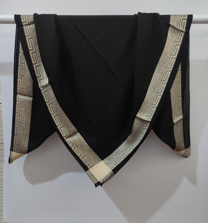 روسری مشکی نخ حریر دور طلایی حریر دووره ترک با قواره ۱۲۰ دور دوخت بسیار سبک مناسب تابستان در قسمت ساده مشکی روسری طرح های ریز برجسته بافت شده است