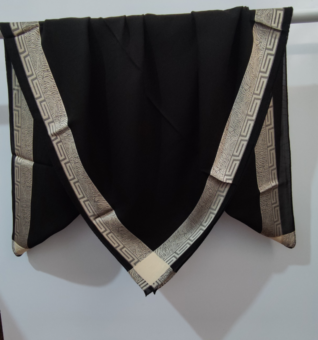 روسری مشکی نخ حریر دور طلایی حریر دووره ترک با قواره ۱۲۰ دور دوخت بسیار سبک مناسب تابستان در قسمت ساده مشکی روسری طرح های ریز برجسته بافت شده است