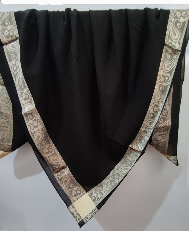 روسری مشکی نخ حریر دور طلایی حریر دووره ترک با قواره ۱۲۰ دور دوخت بسیار سبک مناسب تابستان در قسمت ساده مشکی روسری طرح های ریز برجسته بافت شده است