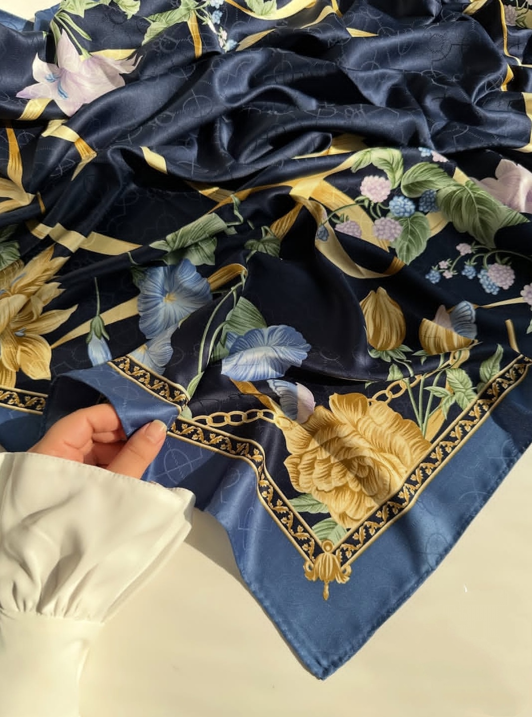 روسری نخ ابریشم ژاکارد وارداتی اورجینال قواره ۱۲۰ دور دستدوز یک روسری مجلسی مناسب چهار فصل برای دوستانی که دنبال روسری شیک و ترند اصل هستن یک روسری فوقالعاده شیک