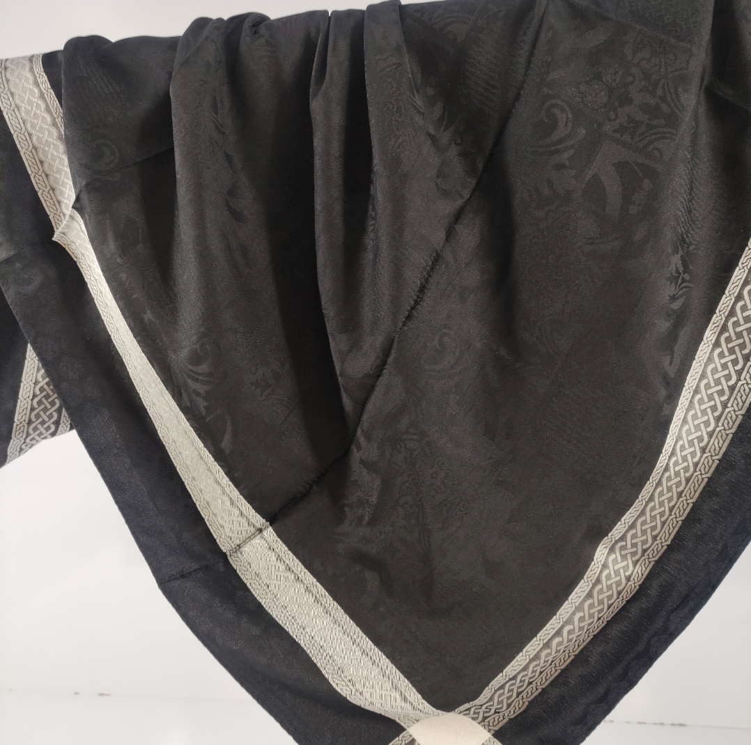 روسری مشکی نخ ژاکارد وارداتی ترک دور دوخت با قواره ۱۰۰ و طرح دور قتب نقره ای اصلأ لیز نیست چروک و دون دون نمیشه