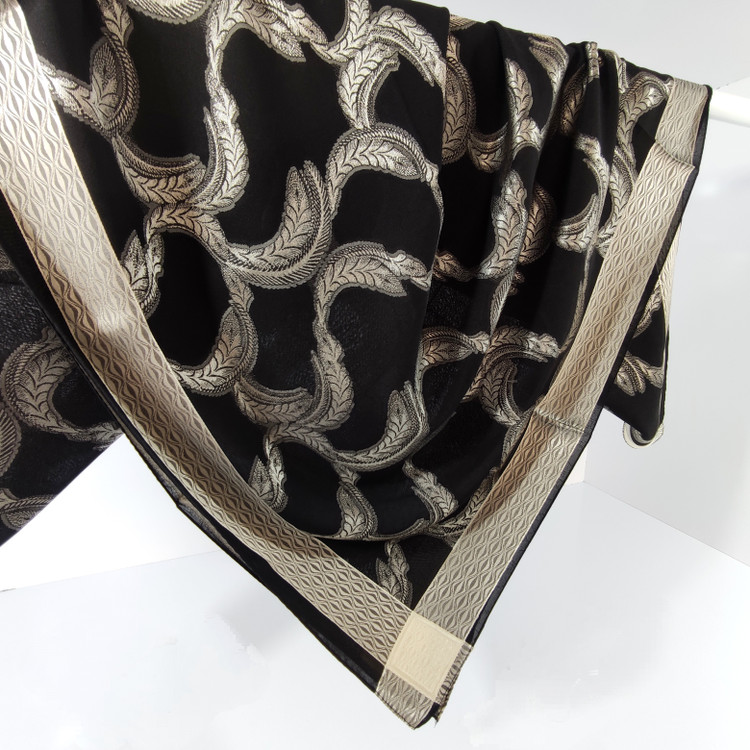 روسری نخ حریر طرح برجسته طلا کوب طرح دور قاب قواره ۱۲۰ دور دوخت ماشینی ریز مناسب فصل تابستان اصلا لیز نیست و به هیچ وج چروک و دون دون نمیشه با کیفیت بسیار عالی سبک و راحت و خنک