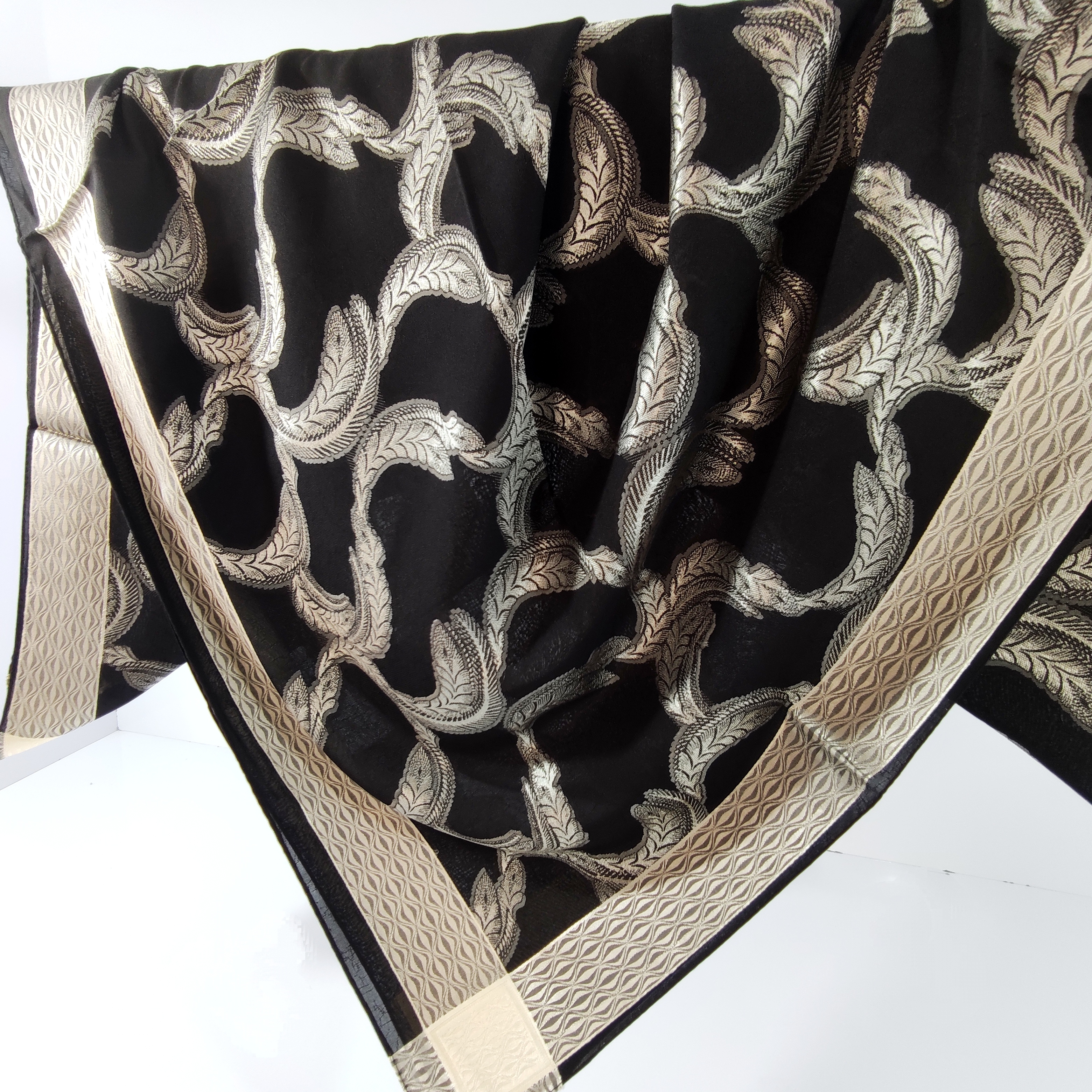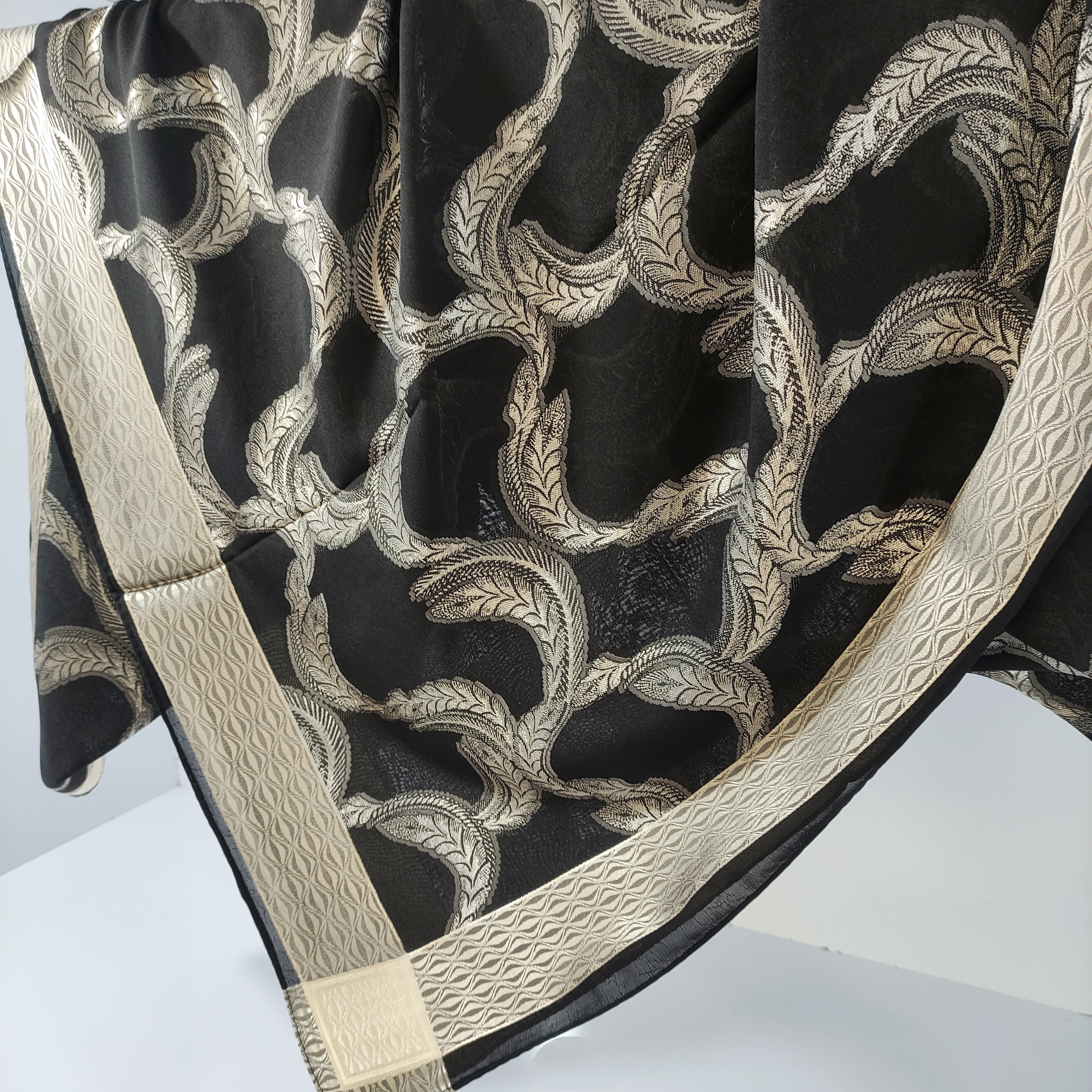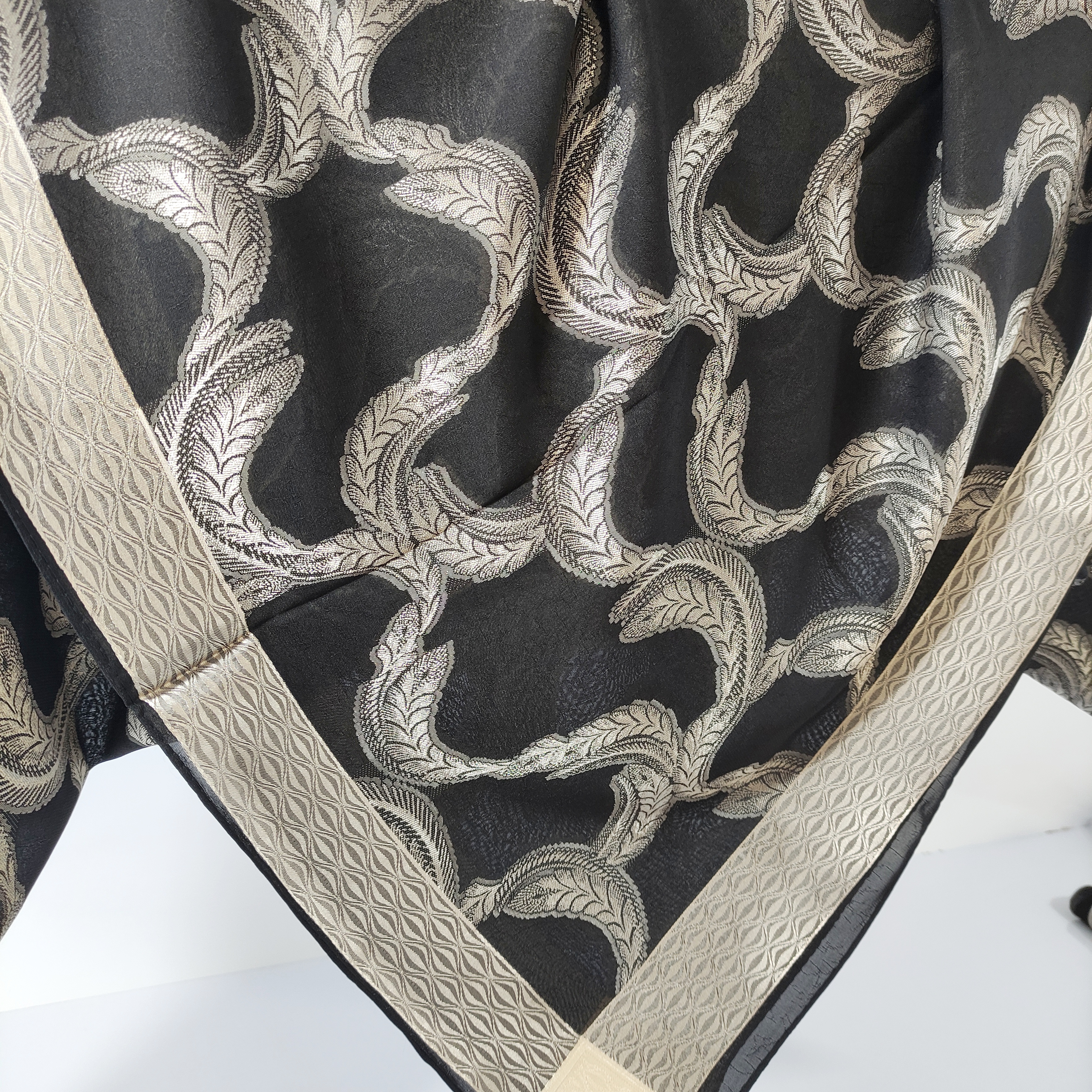 روسری نخ حریر طرح برجسته طلا کوب طرح دور قاب قواره ۱۲۰ دور دوخت ماشینی ریز مناسب فصل تابستان اصلا لیز نیست و به هیچ وج چروک و دون دون نمیشه با کیفیت بسیار عالی سبک و راحت و خنک