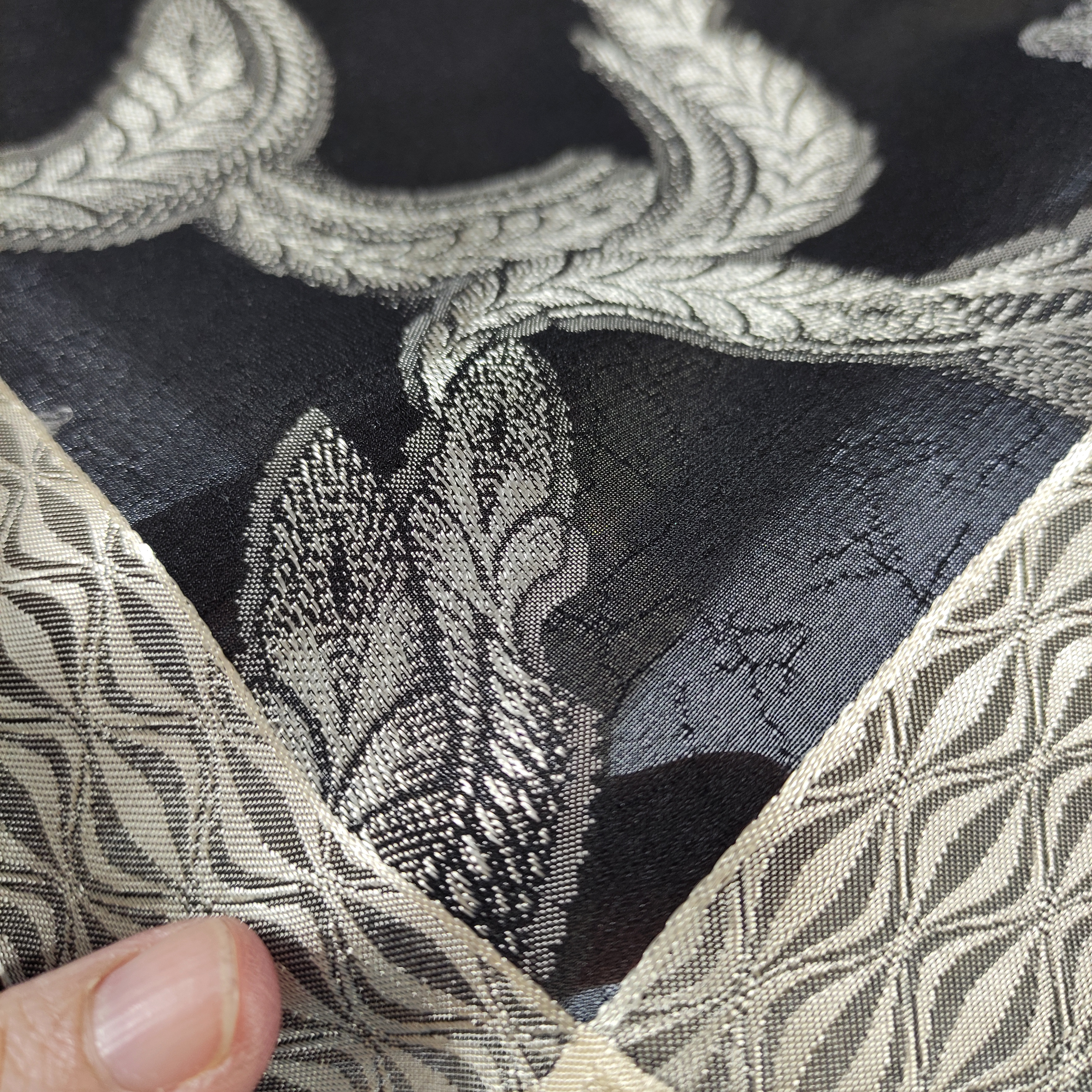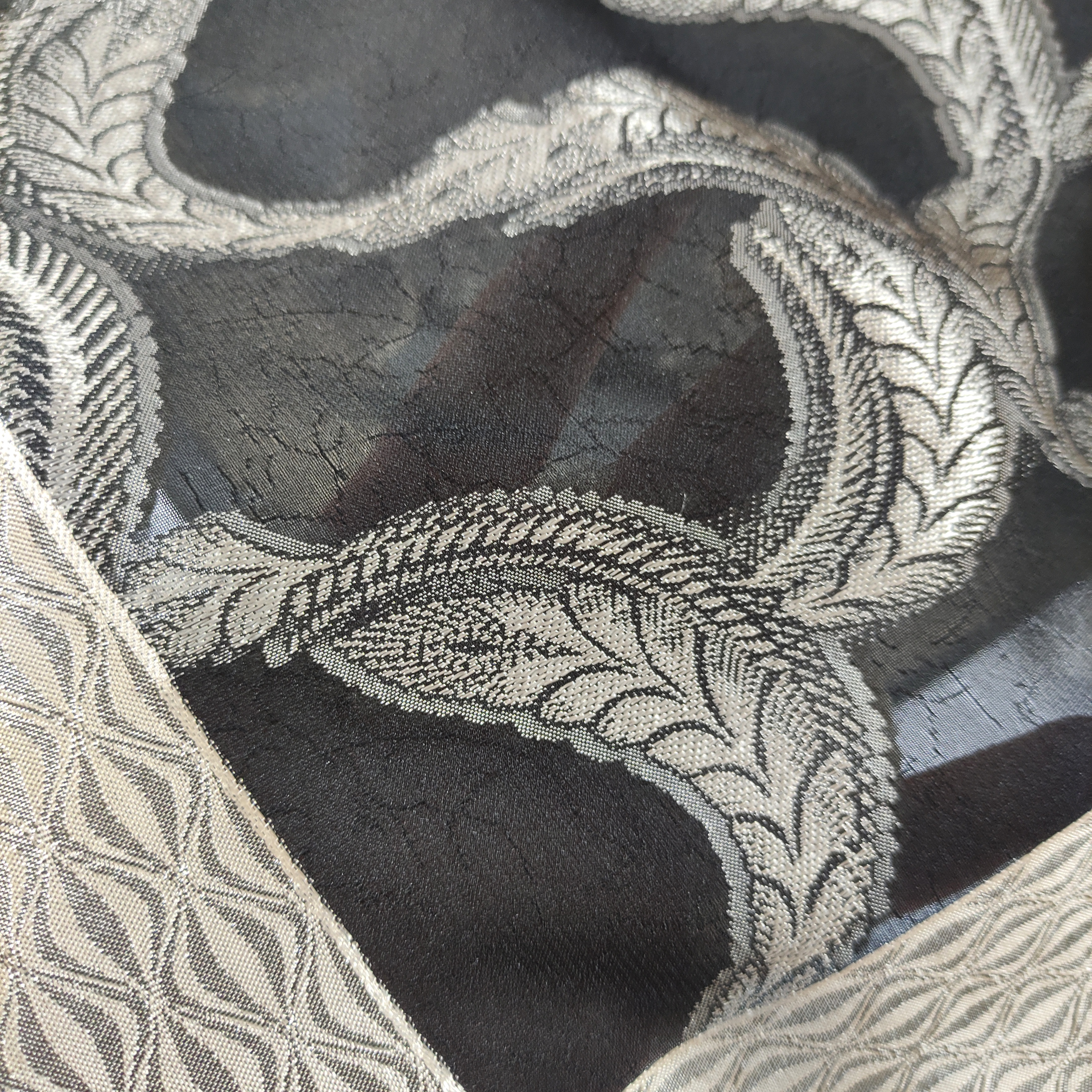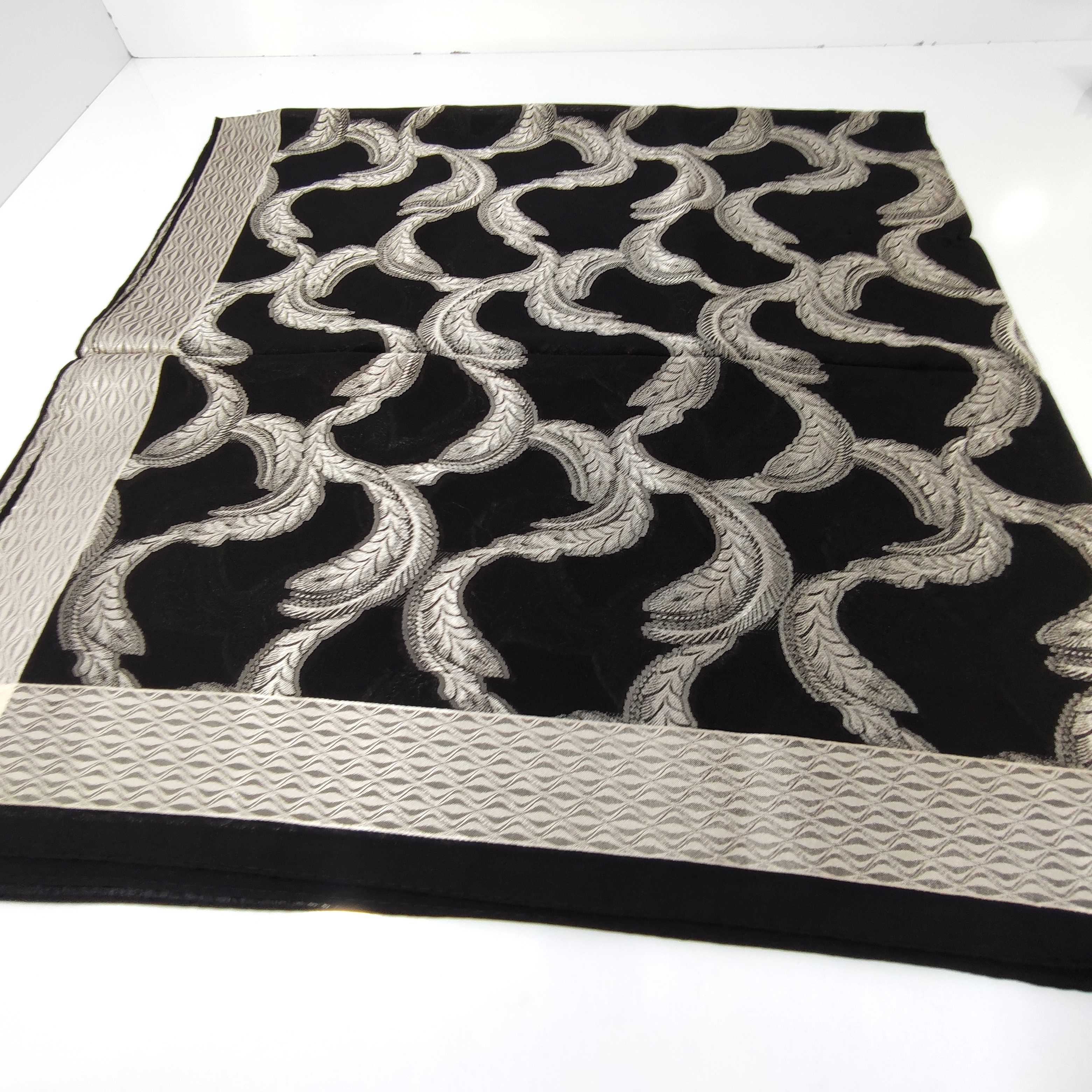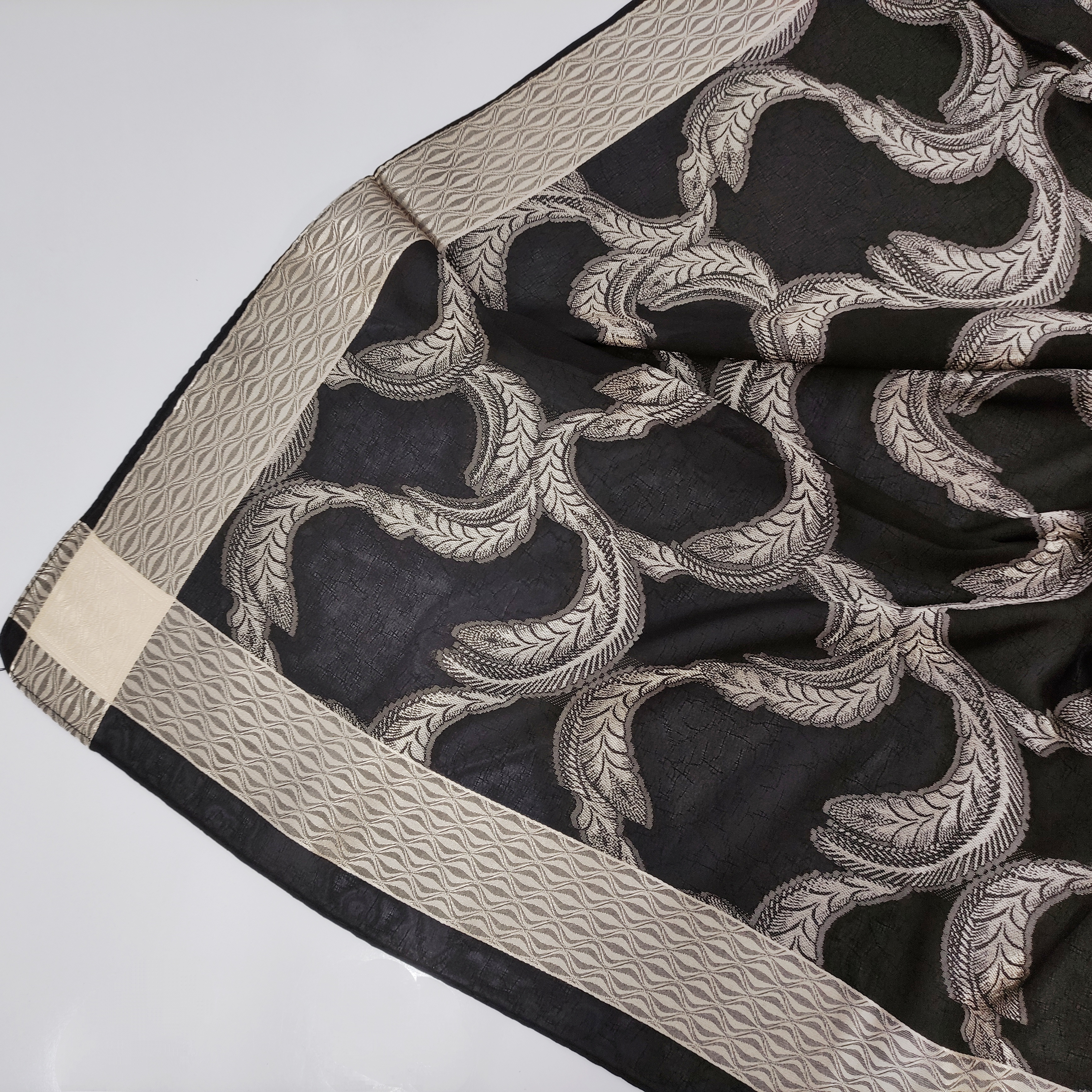روسری نخ حریر طرح برجسته طلا کوب طرح دور قاب قواره ۱۲۰ دور دوخت ماشینی ریز مناسب فصل تابستان اصلا لیز نیست و به هیچ وج چروک و دون دون نمیشه با کیفیت بسیار عالی سبک و راحت و خنک