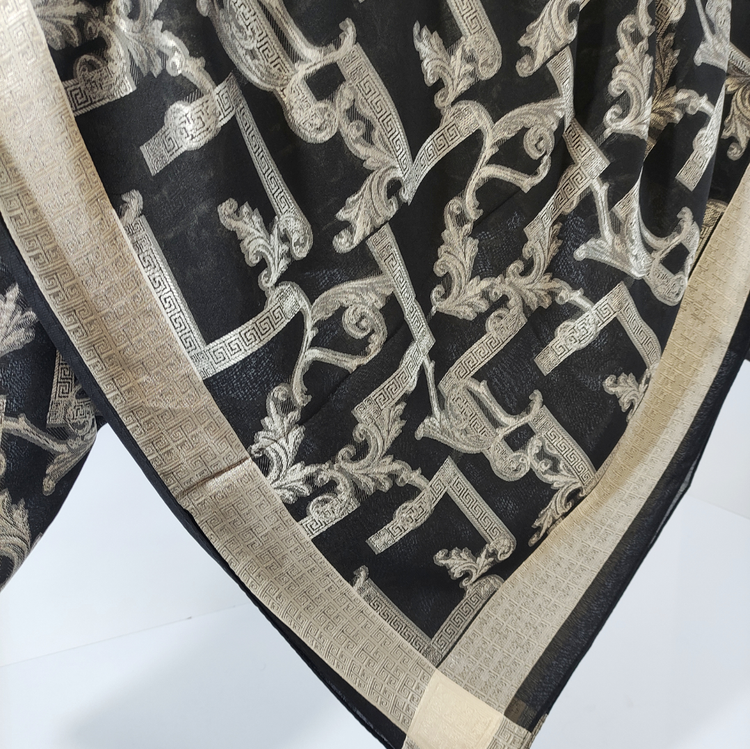 روسری مجلسی مشکی نخ حریر برجسته ترک قواره ۱۲۰ دور دوخت
