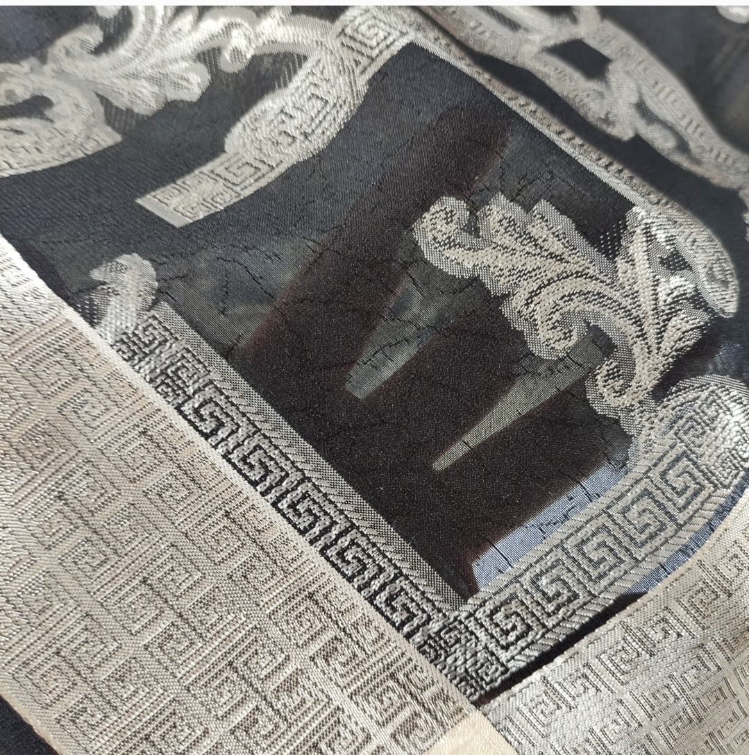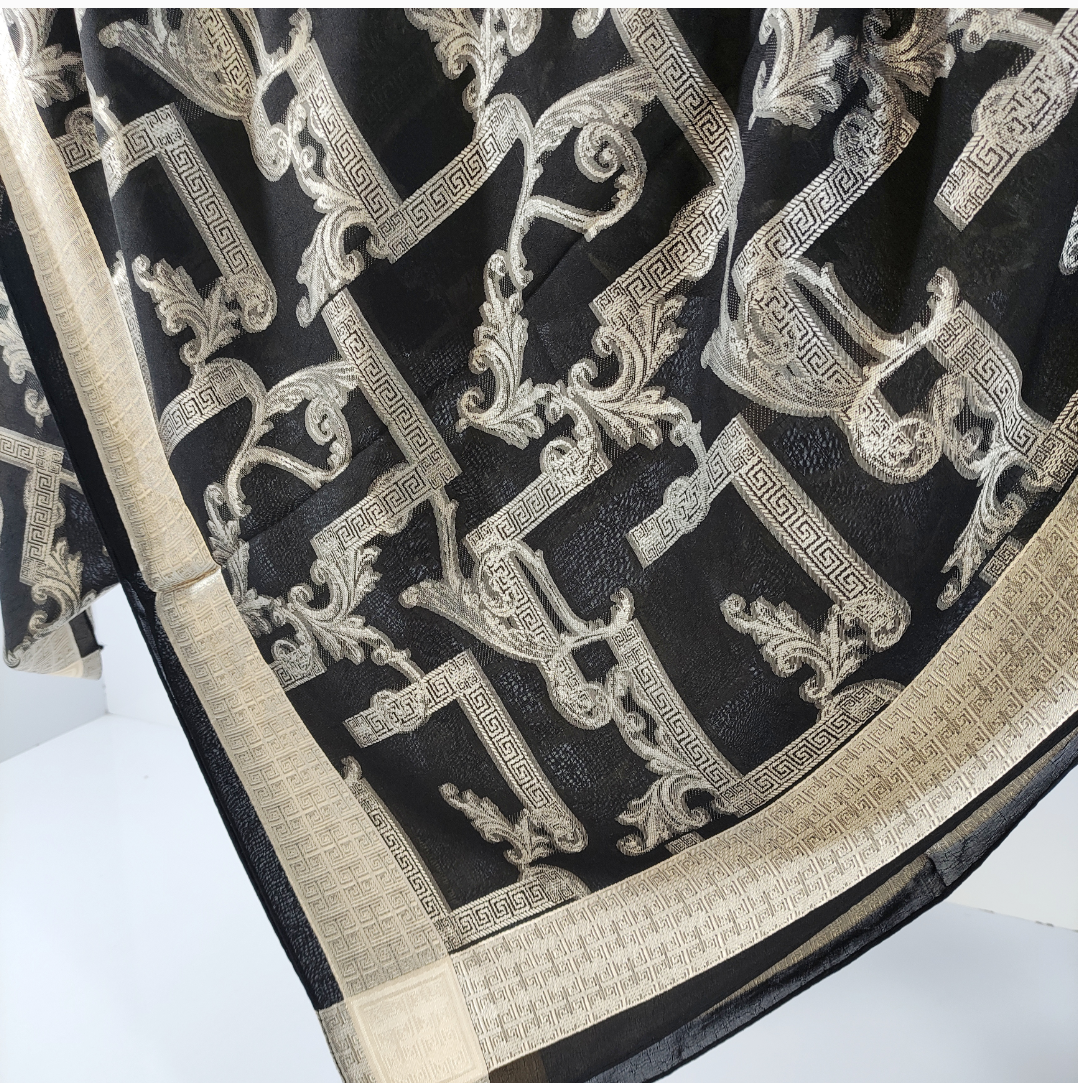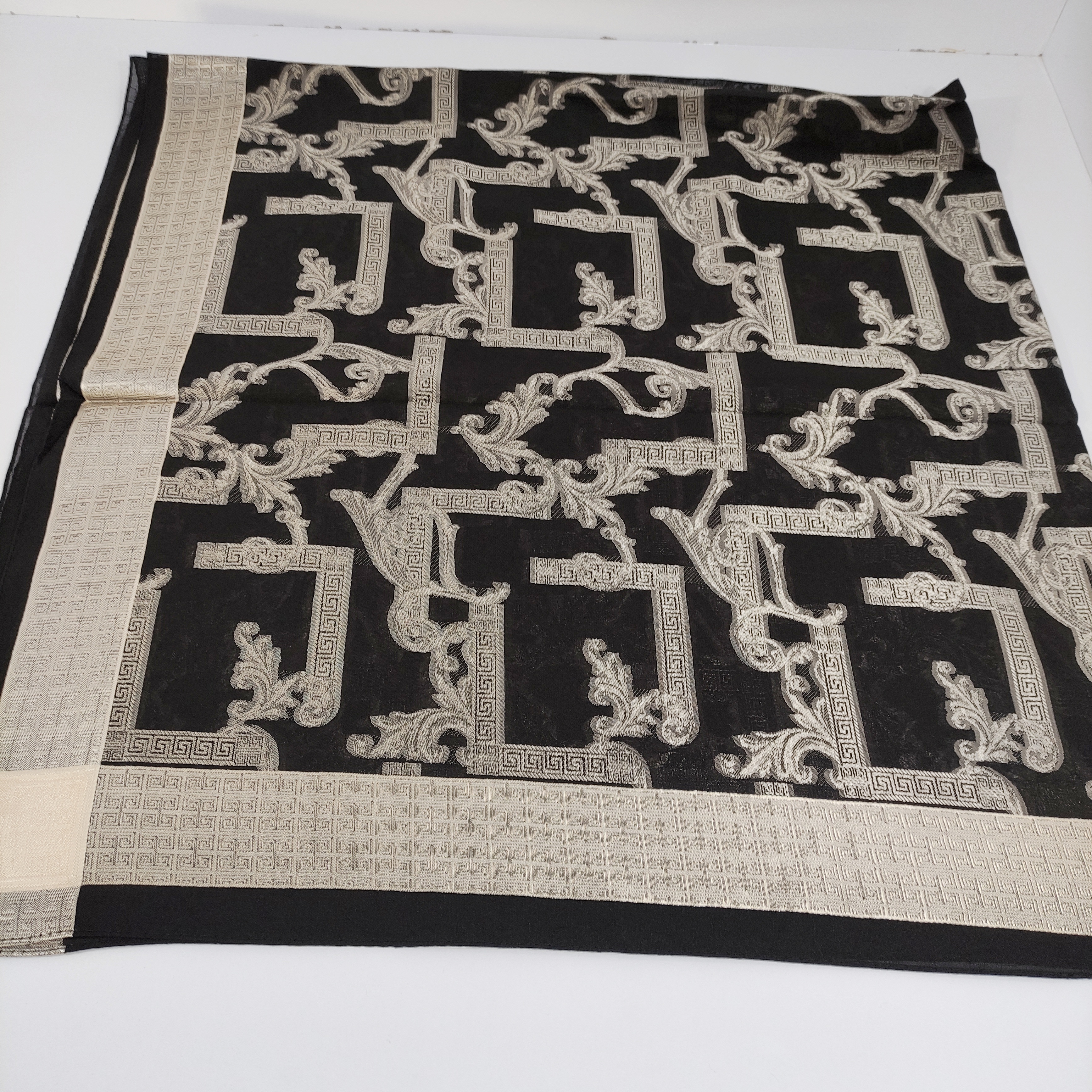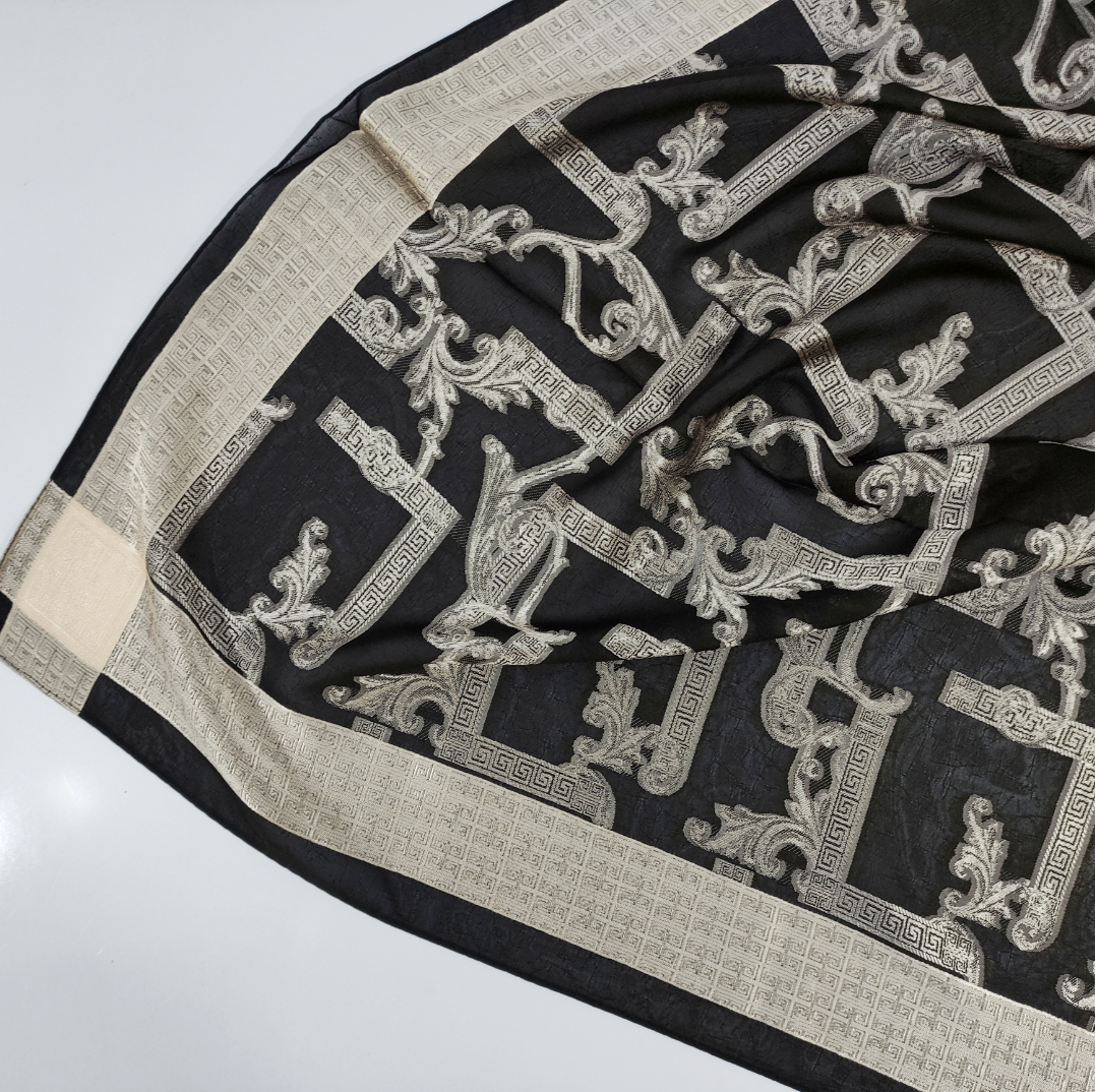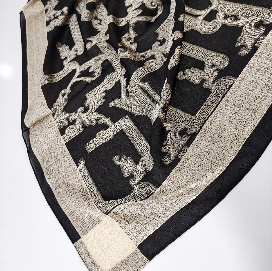 روسری مجلسی مشکی نخ حریر برجسته ترک قواره ۱۲۰ دور دوخت