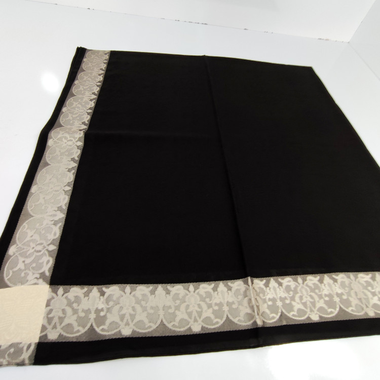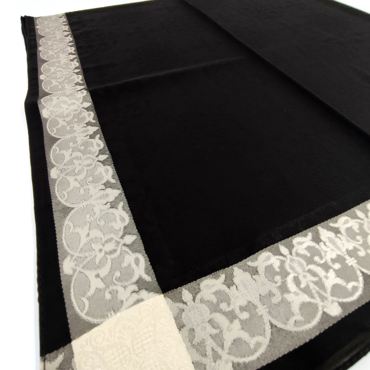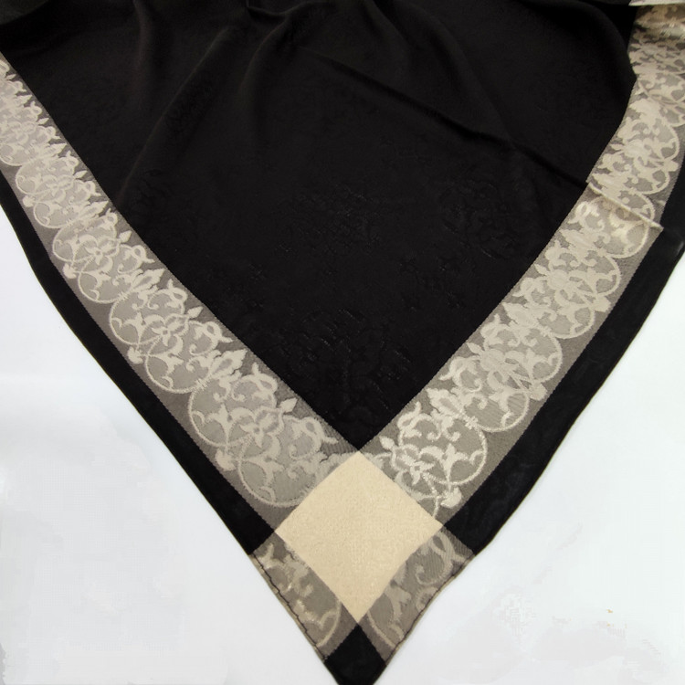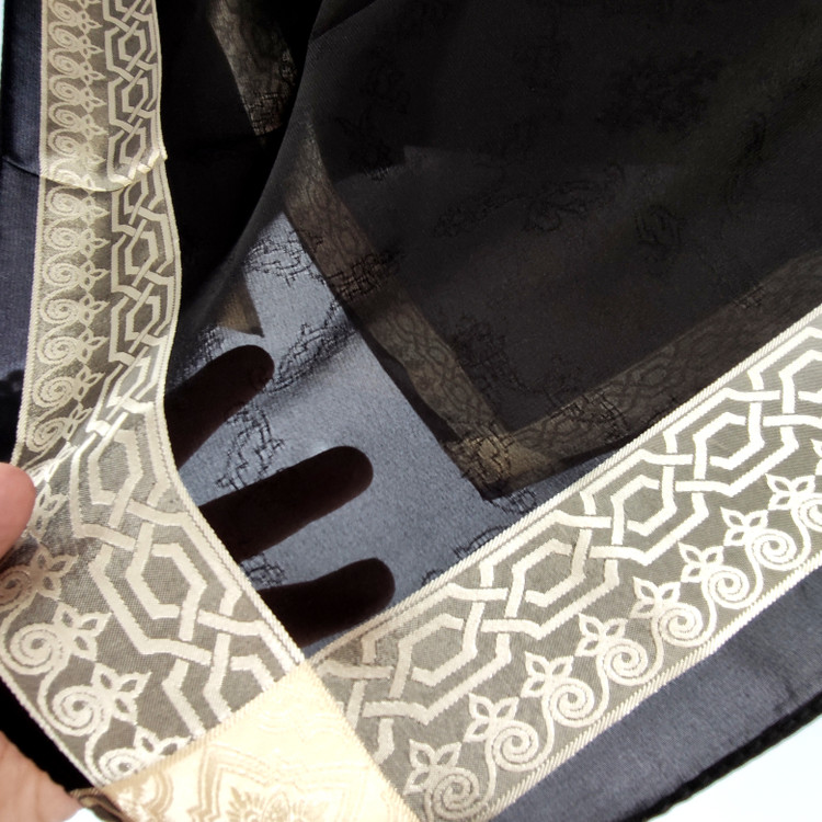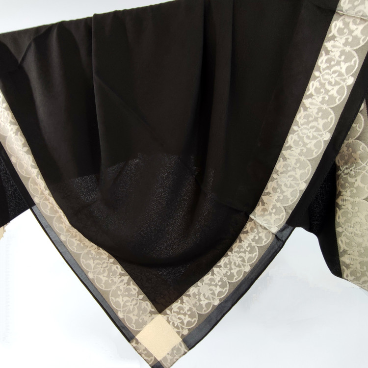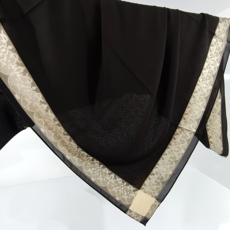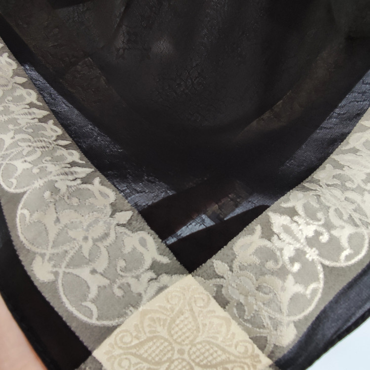 روسری مشکی نخ حریر دور طلایی حریر دووره ترک با قواره ۱۲۰ دور دوخت بسیار سبک مناسب تابستان ،طرحهای ریزی در قسمت ساده مشکی روسری به حالی برجسته بافته شده است