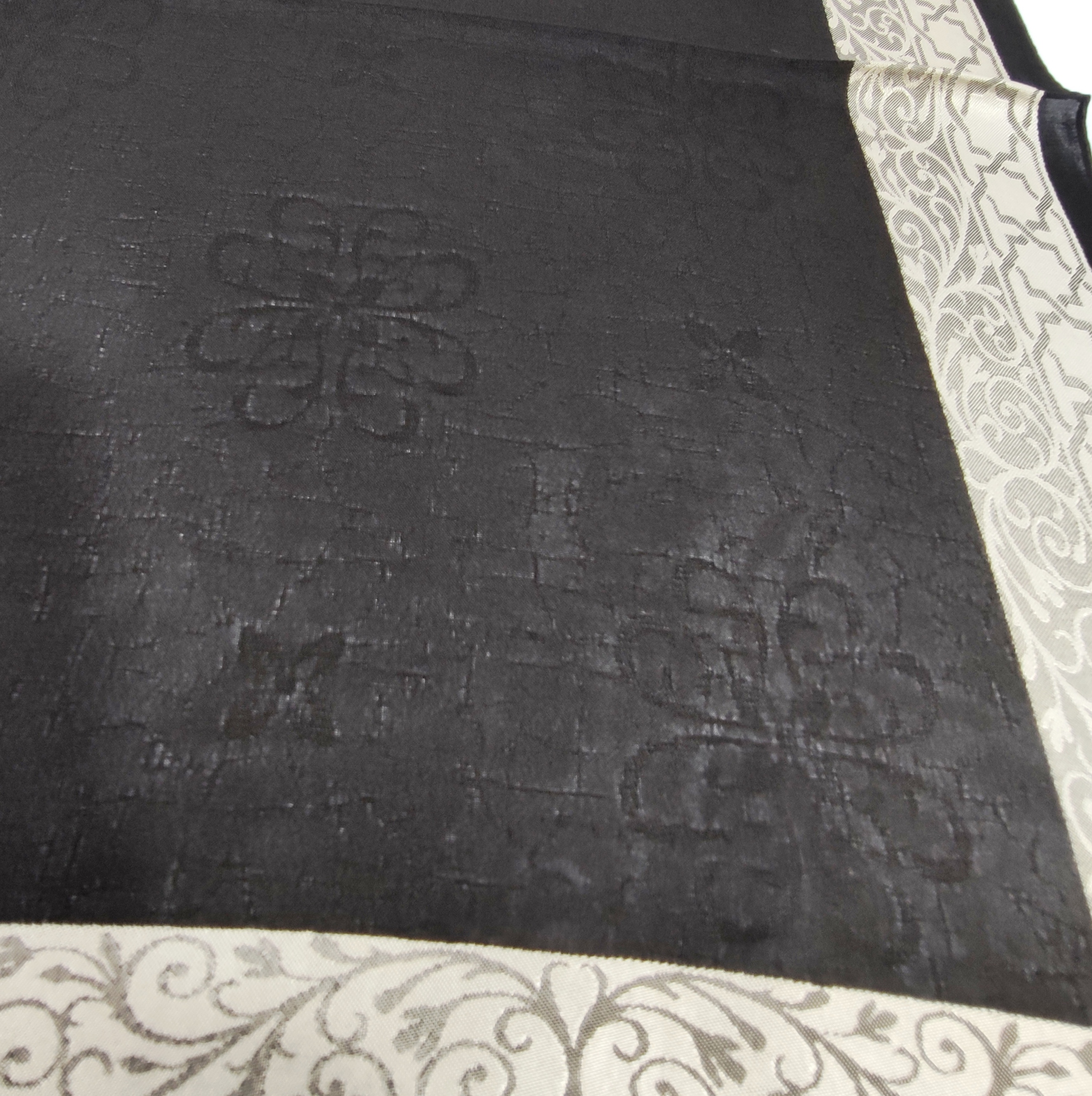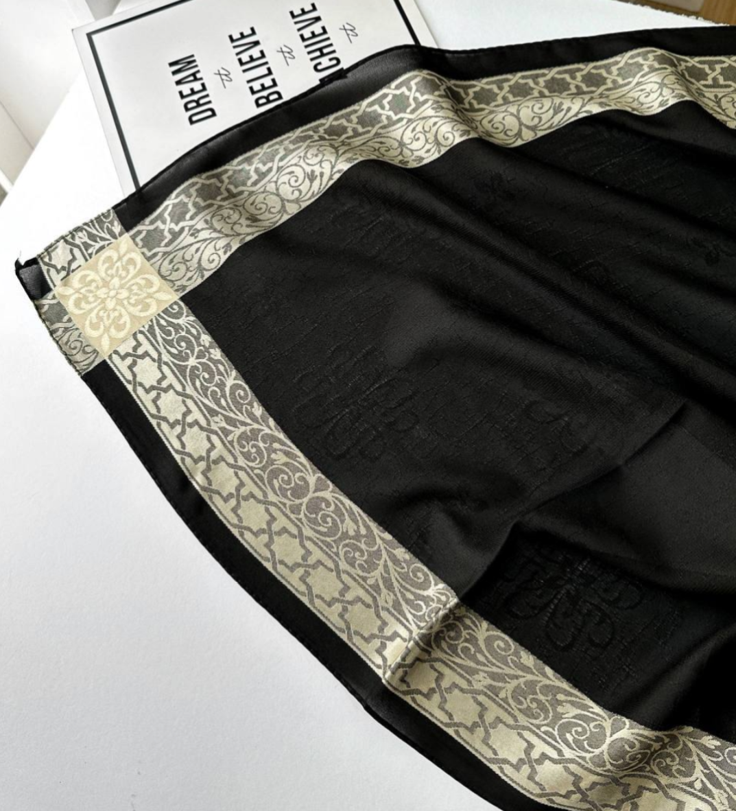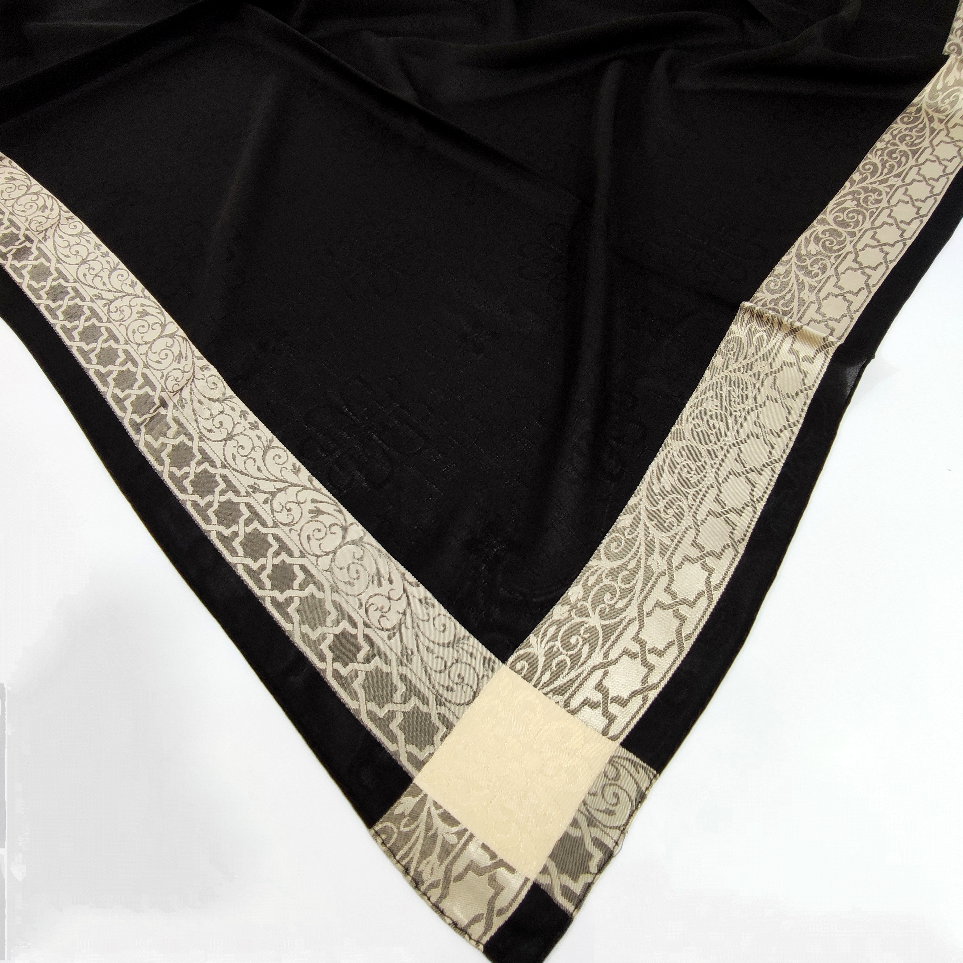 روسری مشکی نخ حریر دور طلایی حریر دووره ترک با قواره ۱۲۰ دور دوخت بسیار سبک مناسب تابستان در قسمت ساده مشکی روسری طرح های ریز برجسته بافت شده است