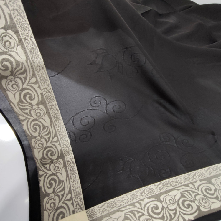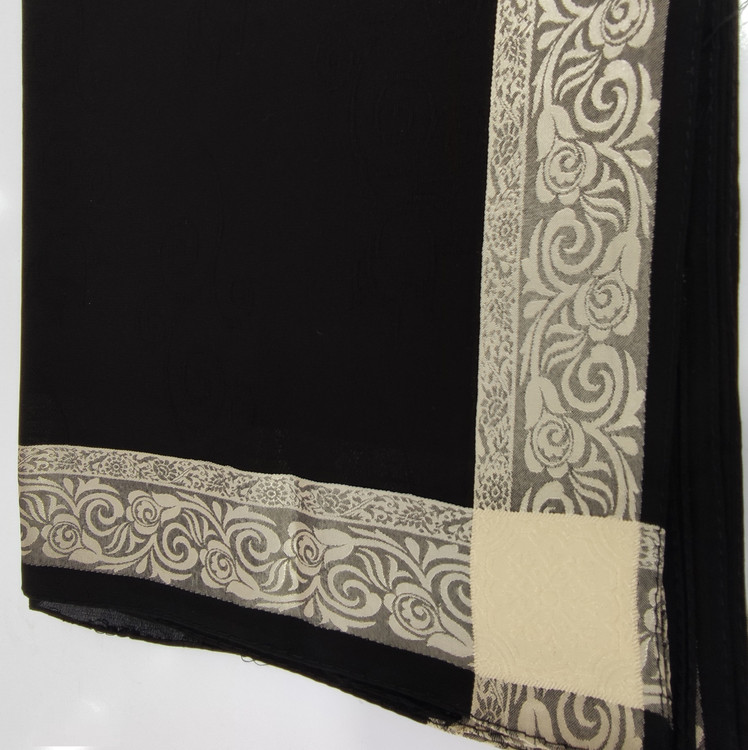 روسری مشکی نخ حریر دور طلایی حریر دووره ترک با قواره ۱۲۰ دور دوخت بسیار سبک مناسب تابستان در قسمت ساده مشکی روسری طرح های ریز برجسته بافت شده است