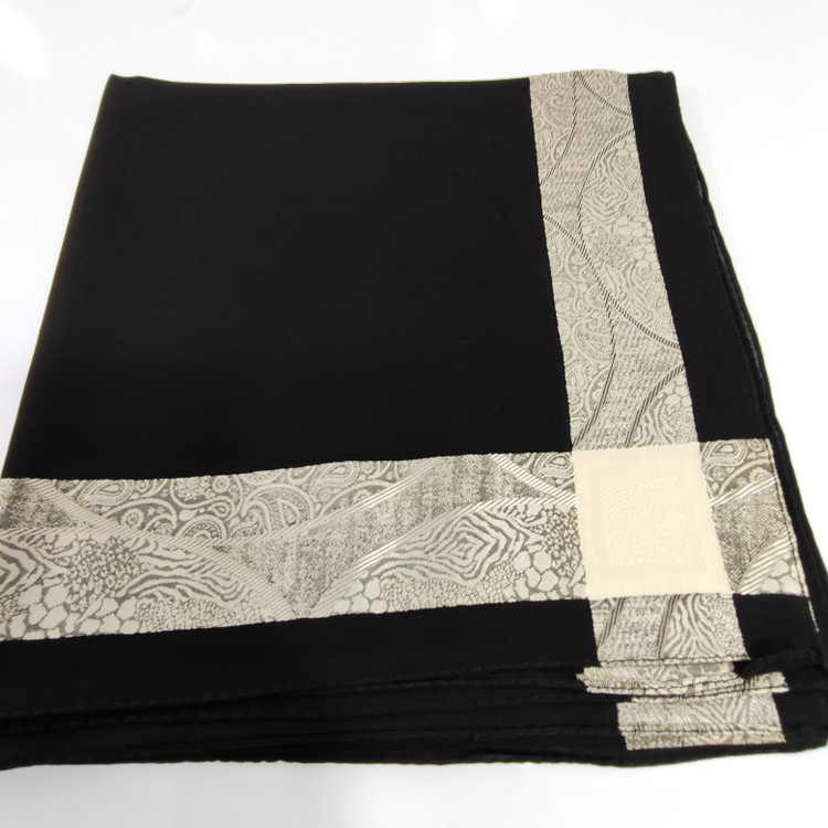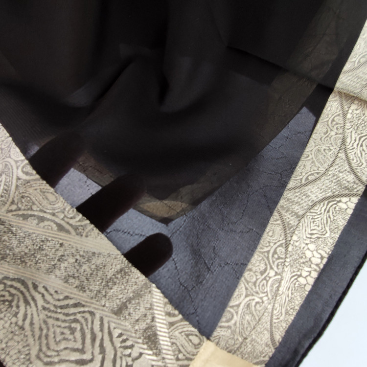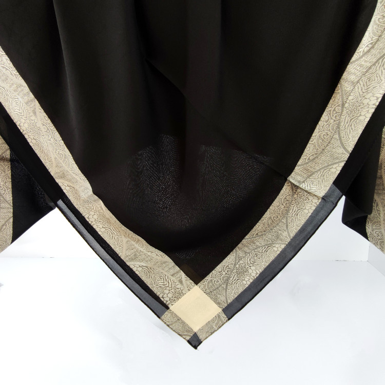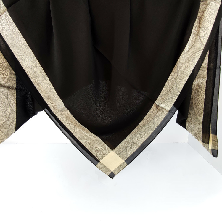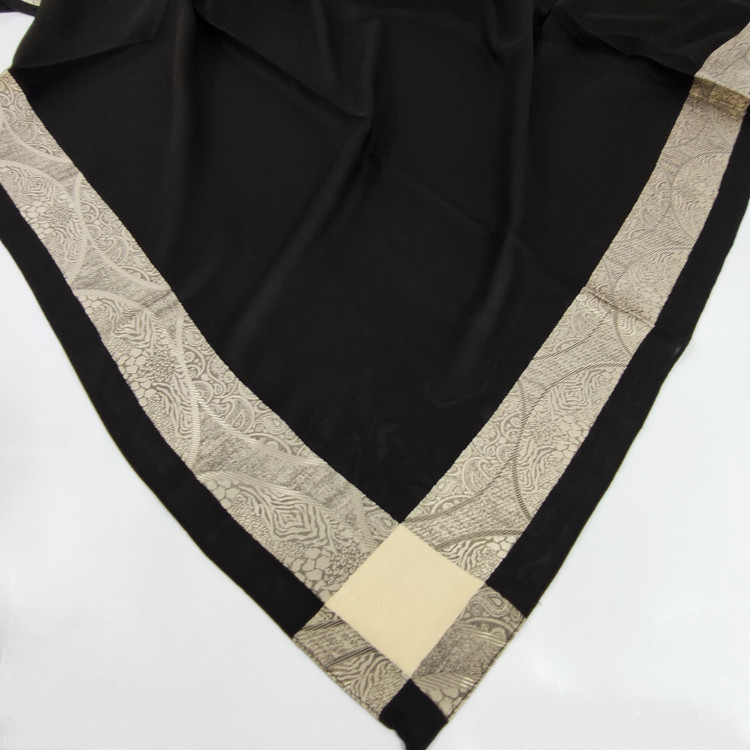 روسری مشکی نخ حریر دور طلایی حریر دووره ترک با قواره ۱۲۰ دور دوخت بسیار سبک مناسب تابستان در قسمت ساده مشکی روسری طرح های ریز برجسته بافت شده است