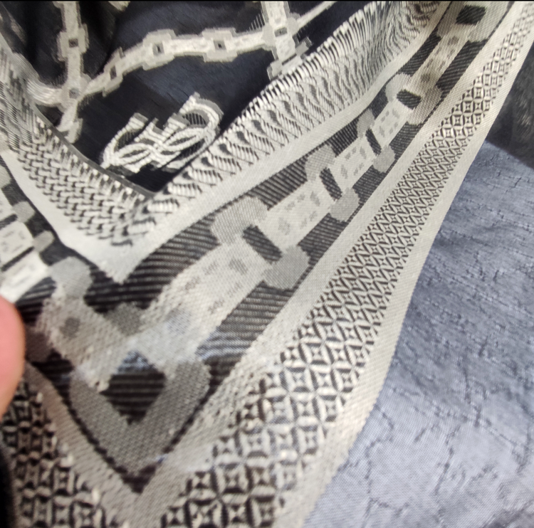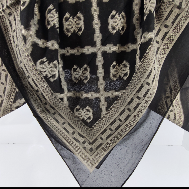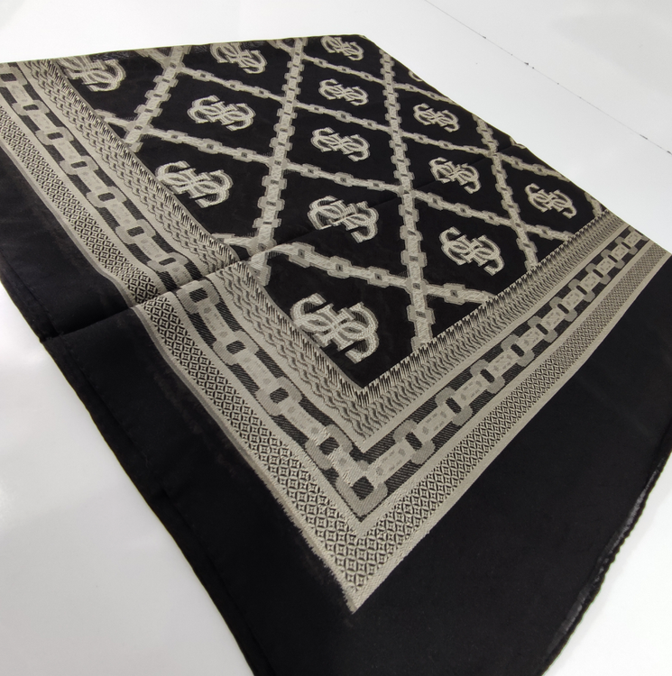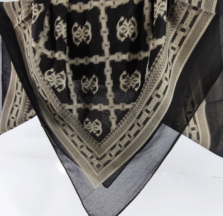 این روسری مناسب بهار و تابستان با رنگ مشکی سیر با طرح های طلا کوب روشن برجسته لیز نیست و چروک و دون دون نمیشه