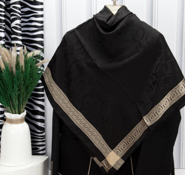 روسری مشکی نخ ژاکارد وارداتی ترک دور قاب طلایی قواره ۱۰۵ دور دوخت